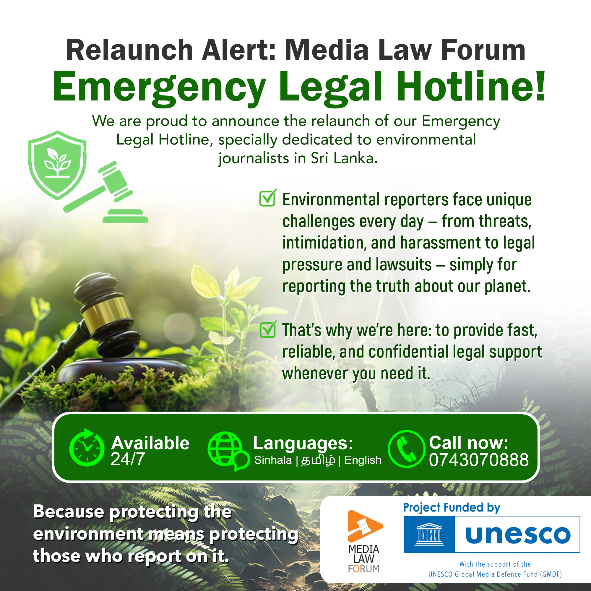 The Media Law Forum (MLF) is proud to announce the official relaunch of its Emergency Legal Hotline, dedicated to supporting environmental journalists in Sri Lanka. This relaunch highlights the Forum’s commitment to providing rapid, reliable, and accessible legal assistance to journalists reporting on environmental issues, who often face unique challenges, threats, and intimidation while performing their vital role in society.